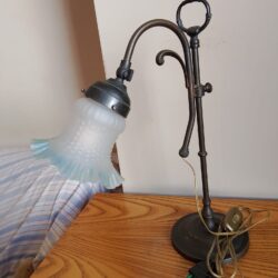 Lampada in ferro battuto pesante in ottimo stato, molto versatile. Lo stelo si muove e pure il cappello in vetro satinato, dove si trova una […]